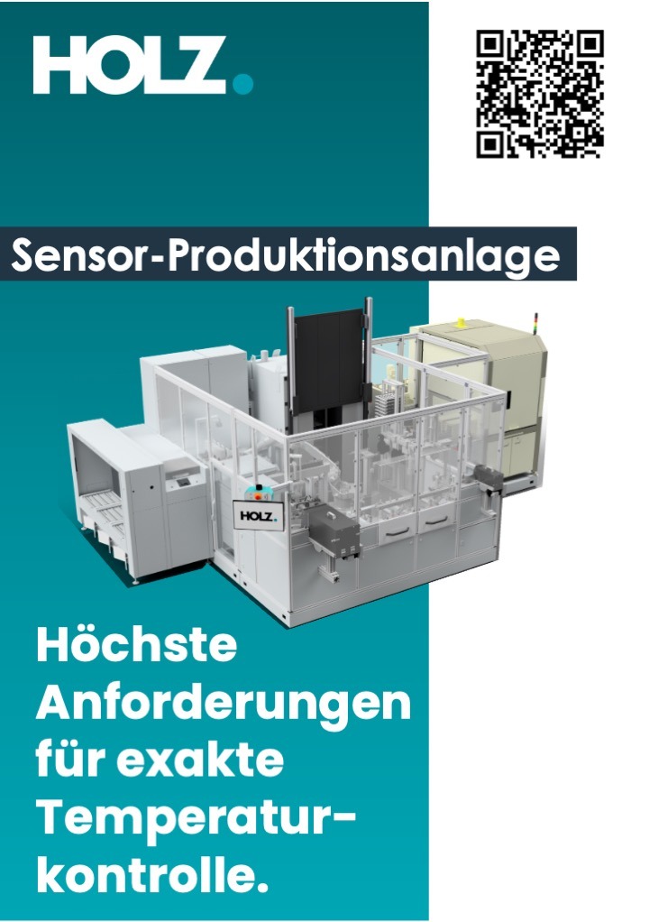 Diese Grafik zeigt eine industrielle Sensor-Produktionsanlage der Firma HOLZ. Das Bild präsentiert eine hochmoderne, automatisierte Fertigungsstation in einer Reinraum-ähnlichen Umgebung, eingefasst in ein Gehäuse mit transparenten Schutzelementen. Der begleitende Text hebt hervor, dass die Anlage höchste Anforderungen für eine exakte Temperaturkontrolle erfüllt. Die Gestaltung ist in den Firmenfarben Petrol und Weiß gehalten und enthält ein Logo sowie einen QR-Code für weitere Informationen.